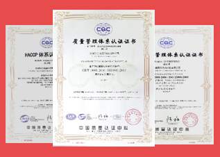 公司順利通過(guò)ISO 9001質(zhì)量管理體系認(rèn)證、ISO22000食品安全管理體系認(rèn)證、HACCP體系認(rèn)證